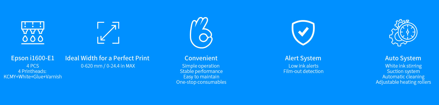 The UV DTF printer is covered by a 2-year limited warranty. Additionally, parts that come in contact with ink, including ink cartridges, printheads, wiper blades,and other consumable parts, are also covered under warranty with an extra cost.